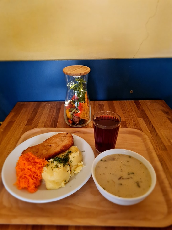 Wziąłem klasyczny zestaw: kotlet schabowy, ziemniaki i surówkę oraz kotlet z piersi kurczaka z tym samym dodatkiem. Do tego kompot – dokładnie taki jak za dawnych lat.